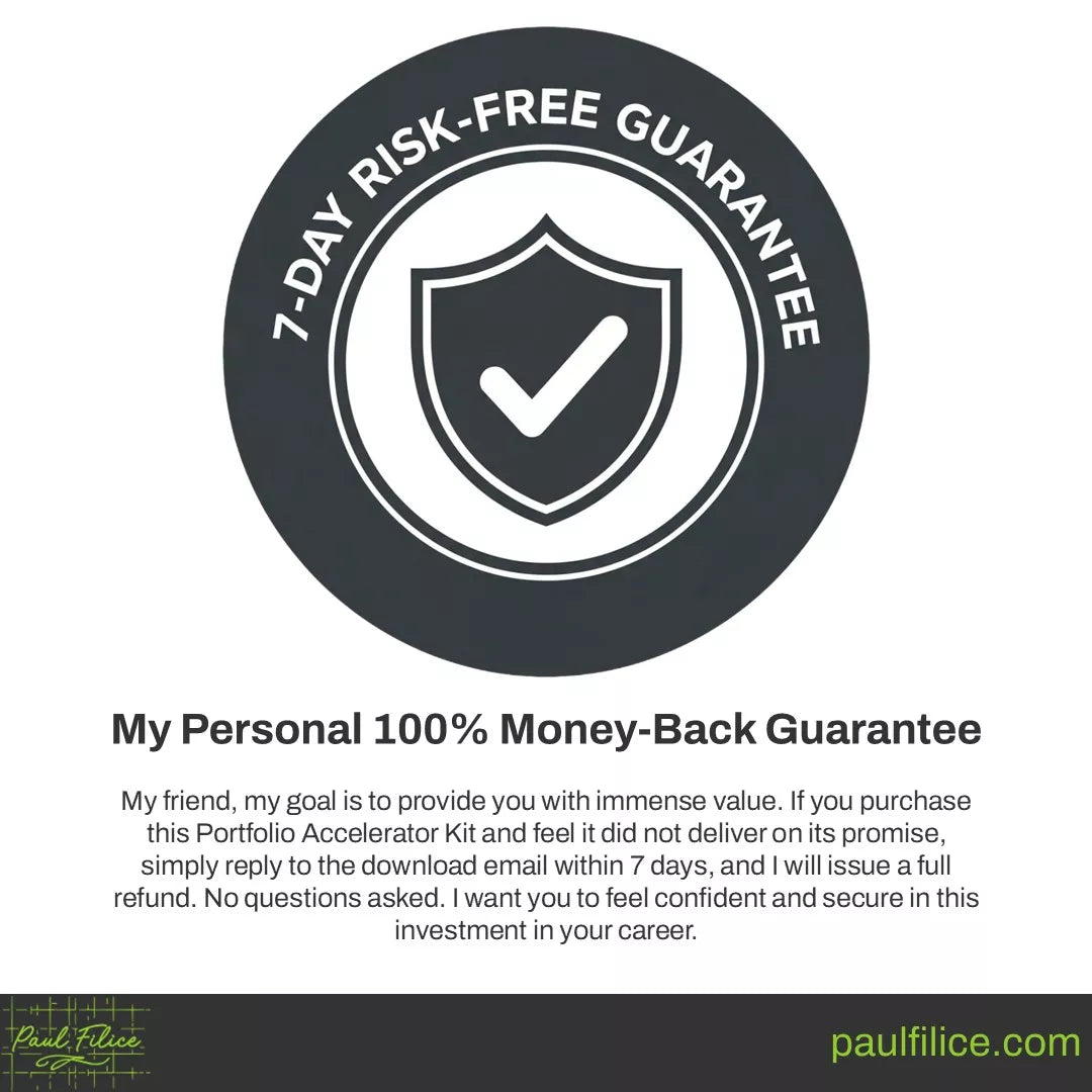 My friend, my goal is to provide you with immense value. If you purchase this Portfolio Accelerator Kit and feel it did not deliver on its promise, simply reply to the download email within 7 days, and I will issue a full refund. No questions asked. I want you to feel confident and secure in this investment in your career.